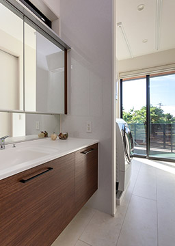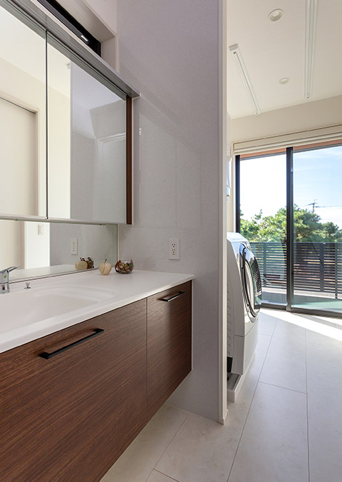 キッチンから直接つながる洗面室。続きに広いランドリースペースを設けて室內干しができるようにしています。南側の掃き出し窓の外にテラスがあり、外干しもスムーズ。造園業を営むEさまは「汚れた作業著のまま、リビングを通らずにテラスから直接ランドリースペースに入れるのが便利」とお喜びです。