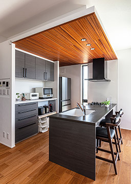 化粧天井が映えるキッチン。バーカウンターとしても活用