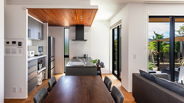 ダイニングキッチンとリビングをL字に配置してテラスを囲む形にしたLDKは、とびきりの明るさと開放感です。「キッチンに立つと、テラスからカーポートまで見渡せます。緑の景色を眺めながら料理や片付けができるので、キッチンに立つのが楽しくなりました」と笑顔のEさま。