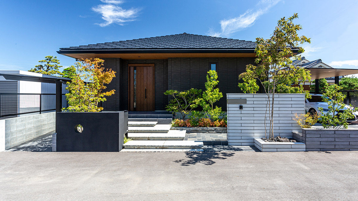 重厚感ある瓦葺きの寄棟屋根が邸宅感を漂わせる端正な平屋のたたずまい。自然石を板狀に配したアプローチの白いステップが黒のシックな外壁を引き立て、植栽の緑が美しく調和しています。