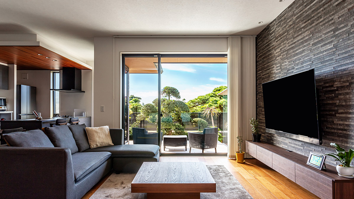 テレビを掛けたアクセント壁が重厚感を漂わせるリビング。リビングの向かい側に広がる造園の松林を借景に生かして、非日常の雰囲気を創り出しています。「ソファでくつろいでいると、テラス越しに視線が広がり、リゾート地にいるような心地よさが味わえます」とEさまは大満足のご様子です。