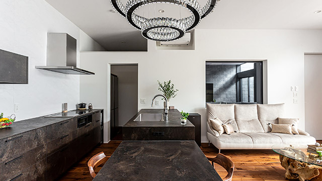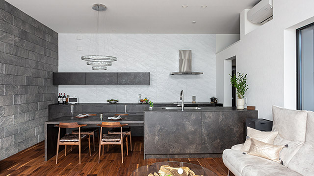 LDKの雰囲気になじむよう、天板が薄く美しい家具のようなキッチンを採用されたFさま。石調タイルと調和し、風格と重厚感が漂っています。「キッチンとダイニングテーブルが一體になっているものを提案していただき、より統一感がある素敵なキッチンになりました」と大満足のご様子です。