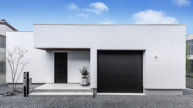 真っ白でシンプルな外観には窓が一カ所もなく、內部への好奇心が高まります。玄関ドアやガレージシャッターをダークカラーにすることで、外壁とのコントラストを高めシャープな印象です。