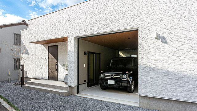 ガレージの天井仕上げを玄関の軒天と同じ木目調にすることで、シャッター開放中も外観に統一感が生まれます。シャッターボックスが天井懐に納まりすっきり見えるのは3m天井高のおかげです。ガレージ內には玄関への出入り口があり、ガレージから直接荷物の搬入ができて便利です。