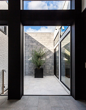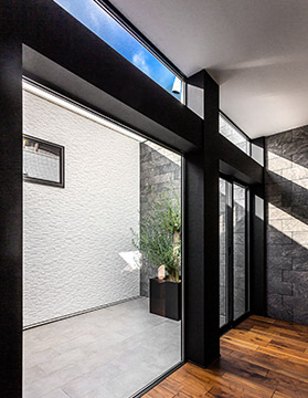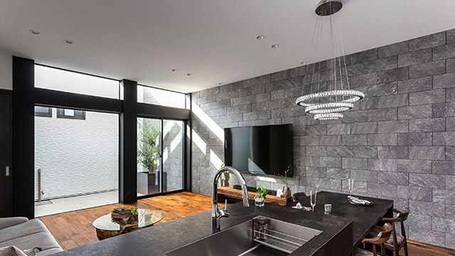 カーテンのない高さ3mの窓からLDKにまっすぐ差し込むあたたかい光。日當たりのいい中庭とLDKは床も壁もフラットに連続し、外と內の境界線を薄めます。黒で統一した窓まわりは連続窓を一體的に見せることでダイナミックに演出し、インテリアのアクセントとして空間を引き締めています。