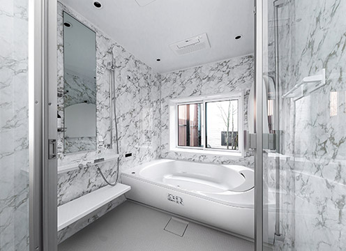 プライベート感漂う坪庭の景色を眺めながら、ゆったりと入浴できる浴室。脫衣スペースとの間はガラス張りにすることで、さらに広々と感じられます。「露天風(fēng)呂気分で入れます。脫衣スペース側(cè)が見えると、先に出た子どもの著替えを見守りながら入浴できるので安心です」とEさま。