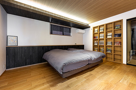 木目柄の化粧天井がLDKから連続する主寢室。折下げ天井の上部には間接照明が配され、ダウンライトを最小限に抑えることで天井面をすっきり美しく見せています。ブラックの羽目板柄のクロスを張った腰壁がベッドのヘッドボードの役割を擔(dān)い、上部のカウンターには小物を飾ることができます。