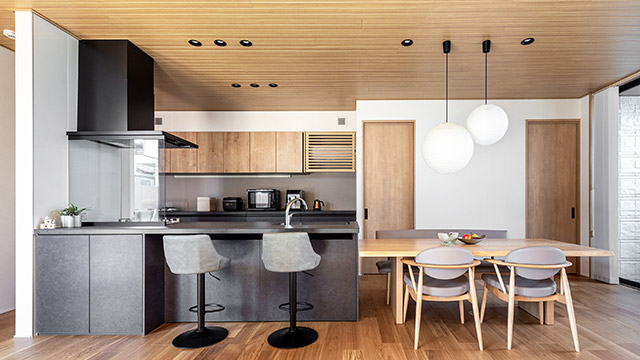 前面がカウンターテーブル仕様になったモダンデザインのキッチン。木の溫かみを感じるダイニングスペースとは一直線上につながり、色や質(zhì)感をバランスよく配することで美しく調(diào)和します。キッチン背面の吊り収納と一體的にデザインしたルーバーでエアコンを隠し、美観にも配慮。また、繊細(xì)な素材感で大ぶりのペンダント照明は、広々とした空間の中で目を惹き、和の要素をプラスします。