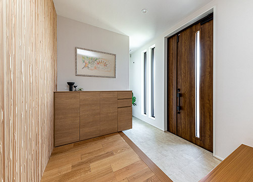 天然木の壁が印象的な明るい玄関