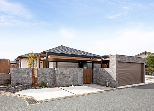 瓦の寄棟屋根が連なる外観にはさりげない和の雰囲気が漂い、室內(nèi)空間とリンクします。カーポートから建物の周りへと門塀が連続し、広い敷地に一體感をもたせています。また、角地にはスペースの余裕を殘すことで、來(lái)客時(shí)の駐車スペースを確保するとともに、前面道路への圧迫感を軽減しています。