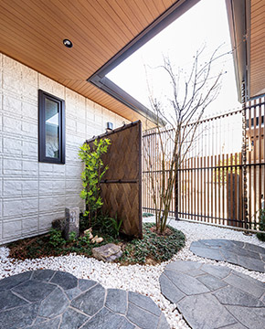 実物件をご案內(nèi)して、ロースタイルリビングなどの空間イメージを膨らませていただきました。ご趣味のキャンプを楽しんでいただけるほどの広い庭と、プライベート感を高めた坪庭の2種類の庭。さらにタタミスペースやヌックなどの居場(chǎng)所を點(diǎn)在させて、さまざまな方向から庭を眺められるようにプランニングしました。和要素とモダン要素のバランスは、3Dパースを用いながらEさまとご相談。「イメージ通りの仕上がりだ」とご満足いただけて嬉しく思います。