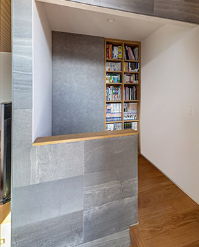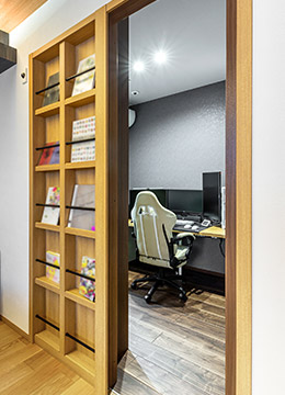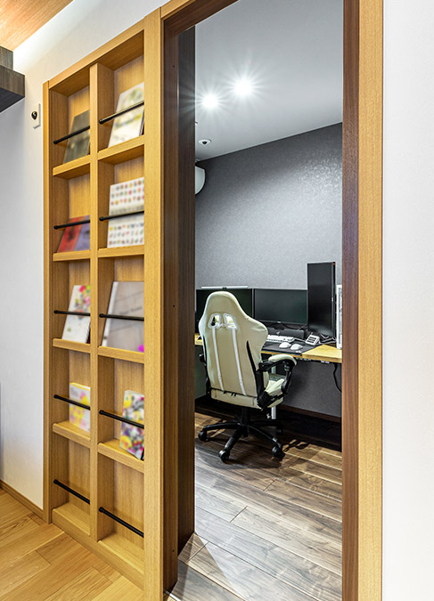 主寢室の壁面収納を押し開くと書斎への入り口が現(xiàn)れます。「子どもの頃に憧れていた隠し部屋。大和ハウスの展示場(chǎng)で見て気に入り、同じ仕様を採(cǎi)用しました」と、遊び心をスマートな形で実現(xiàn)されました。