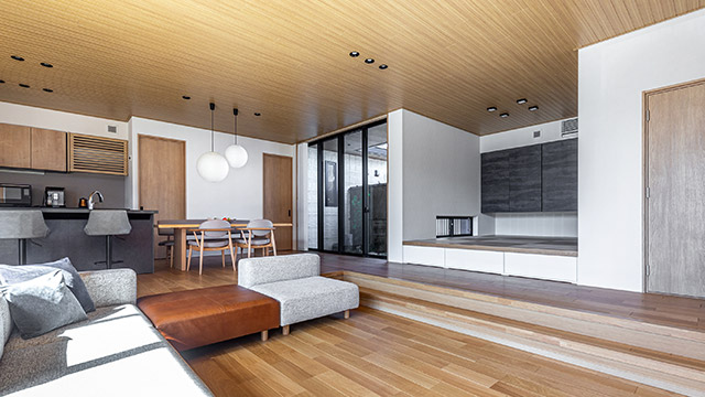 タタミスペースや坪庭、照明などのさりげないデザインによって、和の雰囲気が漂うLDK。広々とした大空間に、小上がりのタタミスペースやロースタイルリビングといった居場(chǎng)所が點(diǎn)在します。また、床の高さに変化をつけることでスペースをゆるやかにゾーニング。座る場(chǎng)所によって視點(diǎn)の高さが変わり、さまざまな眺めを愉しめます。