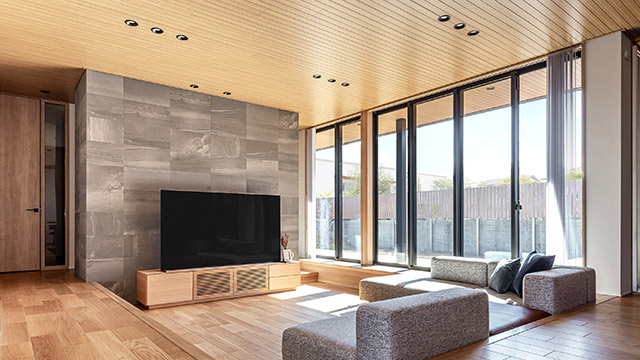 幅5mを超える連続開口から広々とした庭が見渡せるロースタイルリビング。ソファはもちろんのこと、窓外のテラスと高さを揃え奧行きをもたせた窓臺(tái)にも気軽に腰かけることができ、溫かな光に包まれ安らぎます。また、グレーの化粧壁が木質(zhì)感たっぷりの空間の中でアクセントとなっています。