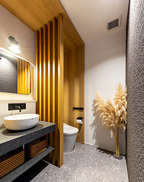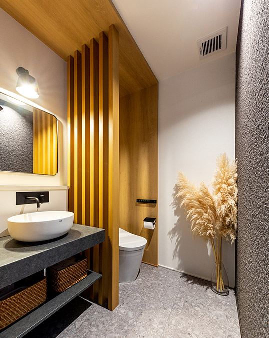 海外のホテルからアイデアを得たという、木目の天井や格子、塗り壁をデザインしたトイレ。トイレの手洗いだけでなく、身支度や帰宅時にも多用途に使える洗面臺を同空間に備え、ゆったりと落ち著ける場所にしました。