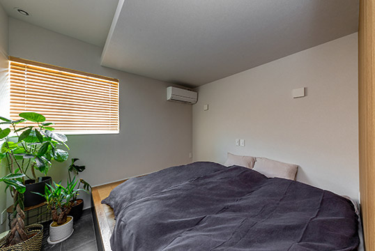 タイルの床材から小上がりになった寢室は、フローリングの床面をベッド代わりにマットレスを敷いています。また、ダウンライトは設けず折下げ天井を利用した間接照明と枕元のブラケット照明で明るさを確保。天井面の美観と就寢前後の眩しさに配慮しています。