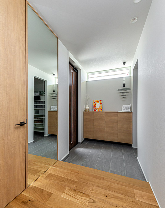 高窓から柔らかい光が回り込む明るい玄関。玄関ドア正面の開口は土間続きの玄関クローゼットにつながります。建具の枠と一體的にデザインしたミラーは空間に溶け込み、映り込みの効果によって面積以上の広さが體感できます。
