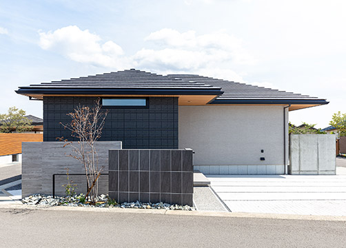 縦橫と方向が異なるデザインの壁がリズミカルに重なった外観。異素材を使いながらも同系色の濃淡でまとめることで落ち著いた印象です。南側は軒を深く張り出すことで室內への日射をコントロールするとともに、外観に陰影を與えています。