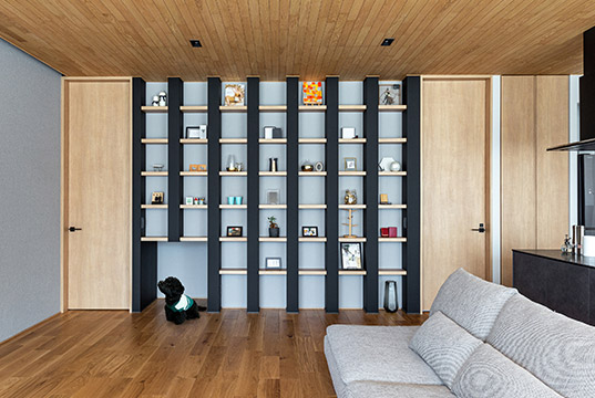 2m72cmの天井いっぱいの高さまであるオープン棚には、お気に入りの小物たちをバランスよくディスプレイ。両側の建具も同じ高さに揃え、一面がすっきりと見えるようにデザインしました。新居を建てて犬を迎えたいというのが家づくりの発端だったというFさま。棚の一部は奧行をもたせ、愛犬が落ち著けるスペースを確保しています。