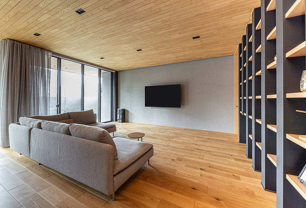 天井の広い面積にオークの化粧材を施したリビングは、自然素材の溫かい雰囲気が漂っています。天井は外の軒天と木目のデザインを合わせ、さらにTV背面のグレーの塗り壁は外壁材と連続感をもたせることで、窓を隔てて內外のつながりが感じられます。