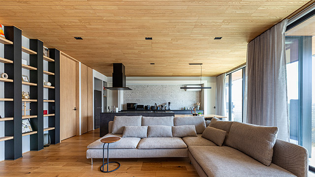オーク、グレー、ブラックの3色にまとめた広々としたLDK。あえて高さを抑えたキッチン周辺は、折下げ天井とその両側の建具、キッチンのレンジフードとダイニングのペンダント照明など、それぞれの高さをぴったり合わせて空間の統(tǒng)一感を高めています。さらに建具は高さによって色を変えることでも、空間の調和を図っています。