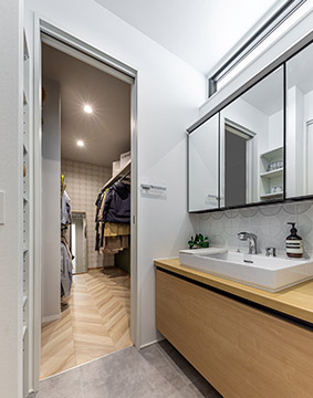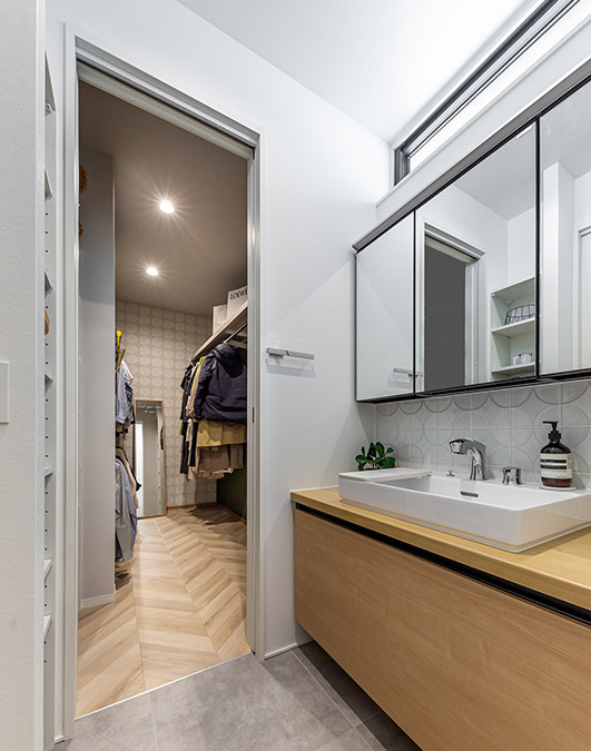 洗面スペースの奧に位置するファミリークローゼット。色味を抑えて統(tǒng)一感を重視したLDKに対して、ここはヘリンボーン柄の床材や遊び心のある柄クロスでコーディネートしました。「コンパクトなプライベート空間だからこそ、LDKのデザインと切り離して冒険してみました」とFさま。