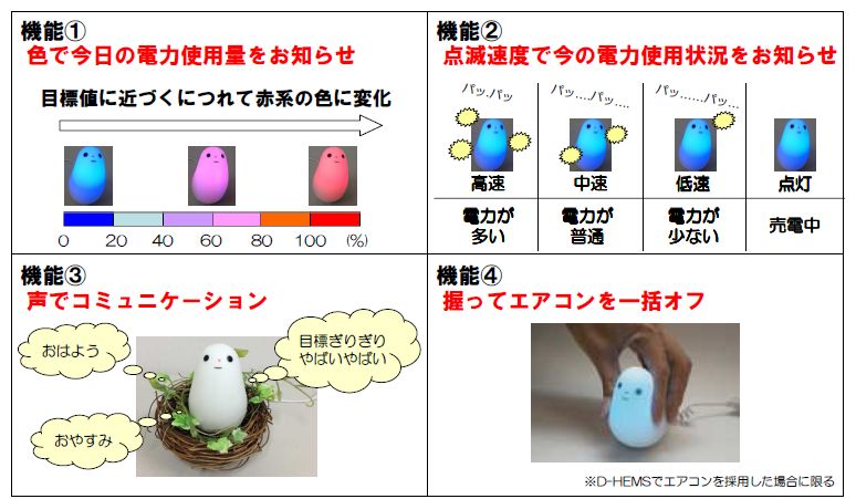 住宅APIを使えば、スマートハウスとロボットを連攜させることもできます。例えばユカイ工學(xué)さんが販売している手のひらサイズのロボットココナッチ。LEDの光の色や點(diǎn)滅、音聲等を使って、様々な情報(bào)を伝えてくれます。もともとはパソコンにつないでメールやツイッターの情報(bào)をお知らせするもの(?詳しくはこちらのページで)ですが、これを住宅と住まい手の様々なコミュニケーションツールとして応用できないかと考えコラボしてみました。第一弾として、HEMSの見(jiàn)える化に活用しています。