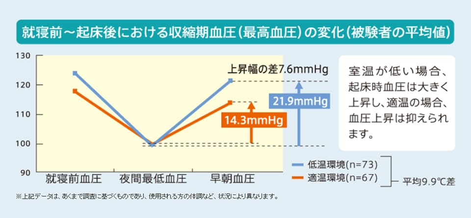 奈良県立醫科大學と共同で、就寢前から起床後における血圧の変化を調査した結果、血圧は就寢前と起床後に高くなりますが、部屋の溫度が低いほど血圧はより高くなることがわかりました。