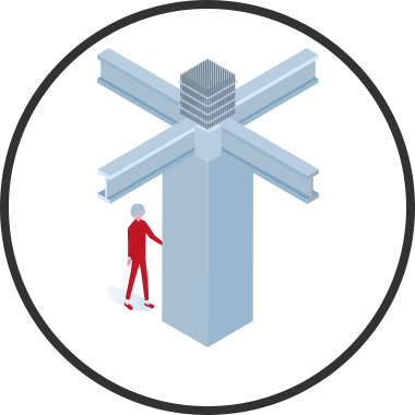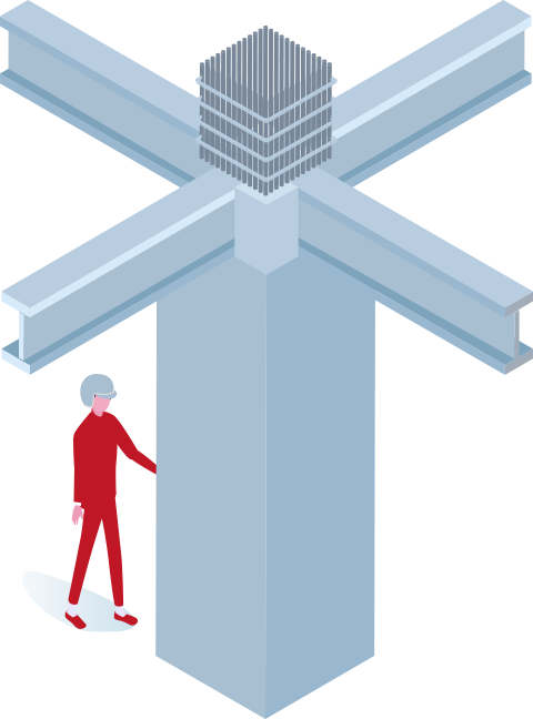1980年代後半には、労働力の質と量の確保が難しくなり、安定した品質を確保しつつ省力化?工期短縮を図る工法の開発が求められ、その一つとして、無溶接構法の開発に取り組みました。