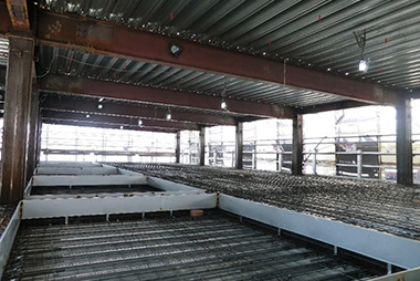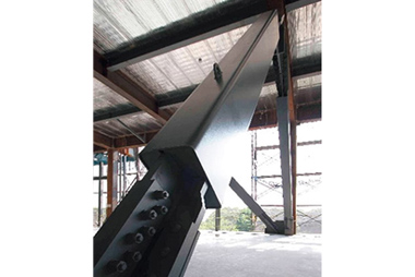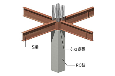 積載荷重が大きく、大空間の建物に適した、鉄骨梁が柱梁接合部を貫通する混合構造技術