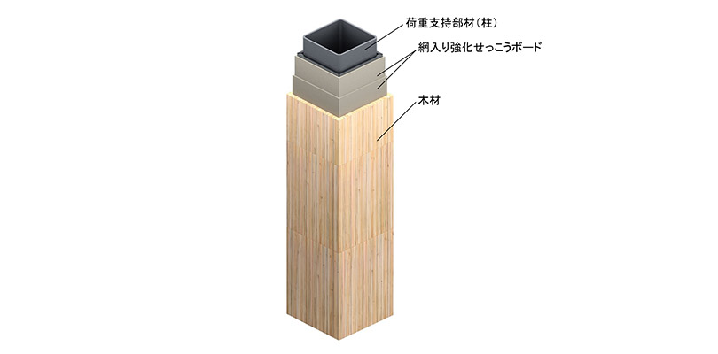 私たちが暮らす地球において、カーボンニュートラルは最優先課題であり、カーボンニュートラル達成には森林の適切な維持管理と同時に木材の利用促進が欠かせません。Dkitto-Columnは、木材と當社の強みである鋼構造とを融合させたハイブリッド技術です。燃え止まり層に用いた網入り強化せっこうボードにより耐火性能を強化し、燃え代層にはさまざまな樹種の木材を用いることができるため、地域木材活用に繋がります。