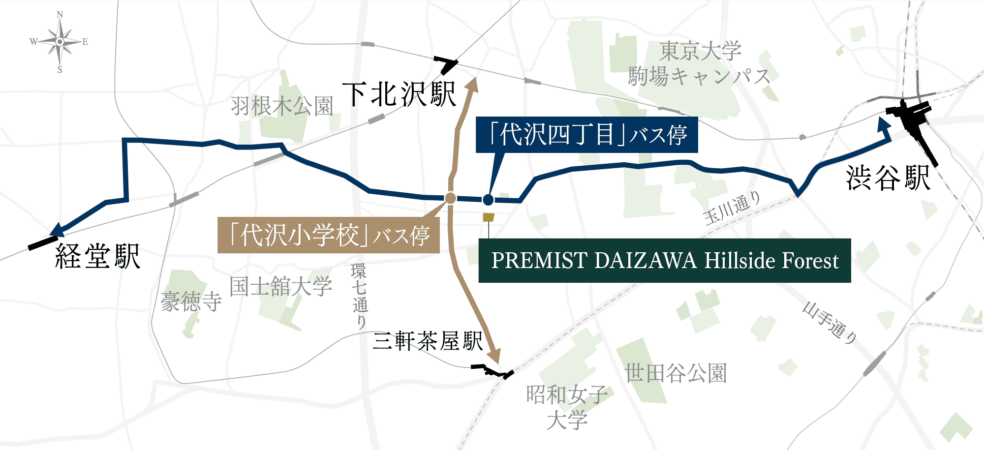 ※小田急小田原線「下北沢」駅まで徒歩15分、京王井の頭線「下北沢」駅まで16分、京王電鉄井の頭線「池ノ上」駅まで徒歩14分、東急田園都市線?東急世田谷線「三軒茶屋」駅まで徒歩17分