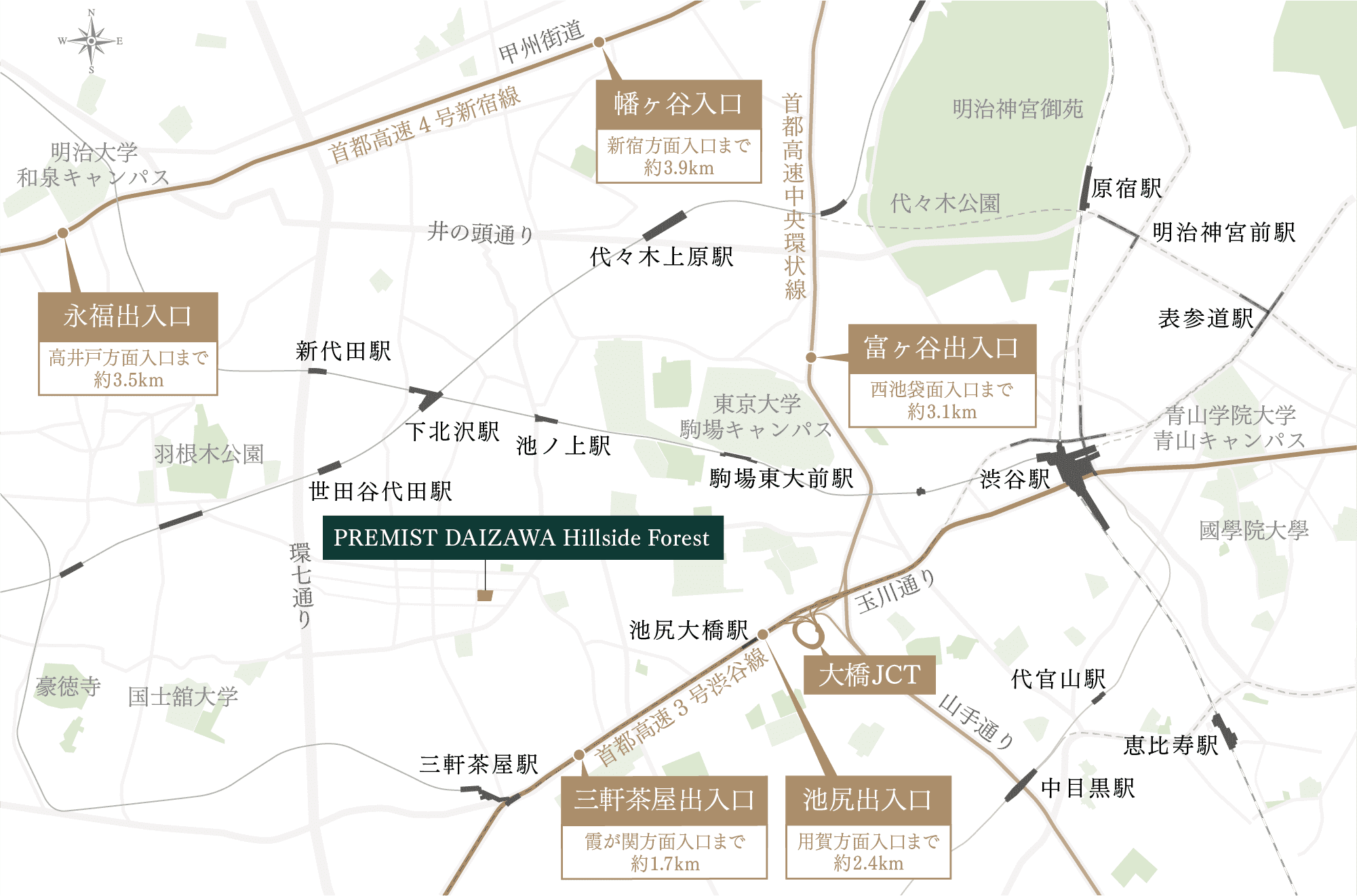 ※現(xiàn)地から首都高速3號線まで約1.4km、4號線まで約3km、中央環(huán)狀線まで約2.2km。