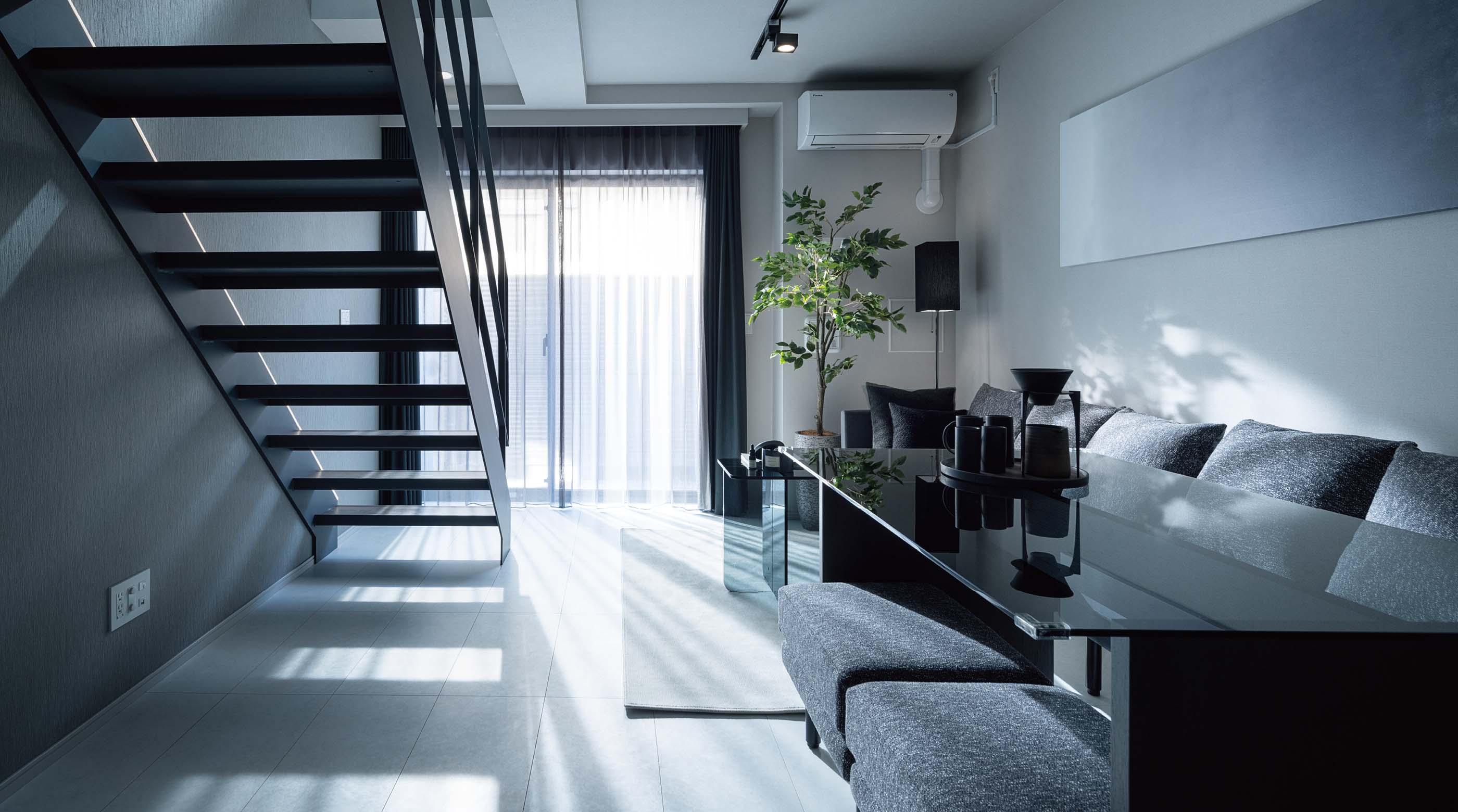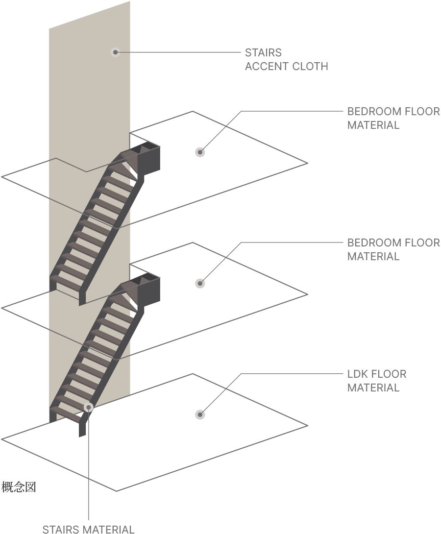 メゾネットプラン概念イラスト(Bタイプ)外観デザインが持つシンプルでモダンな印象を室內にも取り入れたインテリアコーディネートを追求。LDK空間は床や壁は薄い色、ドアノブやキッチンの建具など面積の小さいものは濃い色とした濃淡のグラデーションをつくることで、空間の圧迫感を軽減し、自然な広がりを感じさせます。