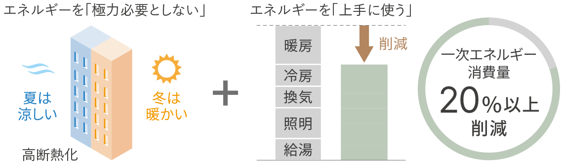 「ZEH-M Oriented」(ゼッチ?マンション?オリエンテッド)とは、住棟全體で年間の一次エネルギー消費量を20%以上削減したマンションのこと。快適な室內環境を保つ、高斷熱で高効率なエネルギー使用を実現する設備を導入することで、光熱費の削減にもつながります。