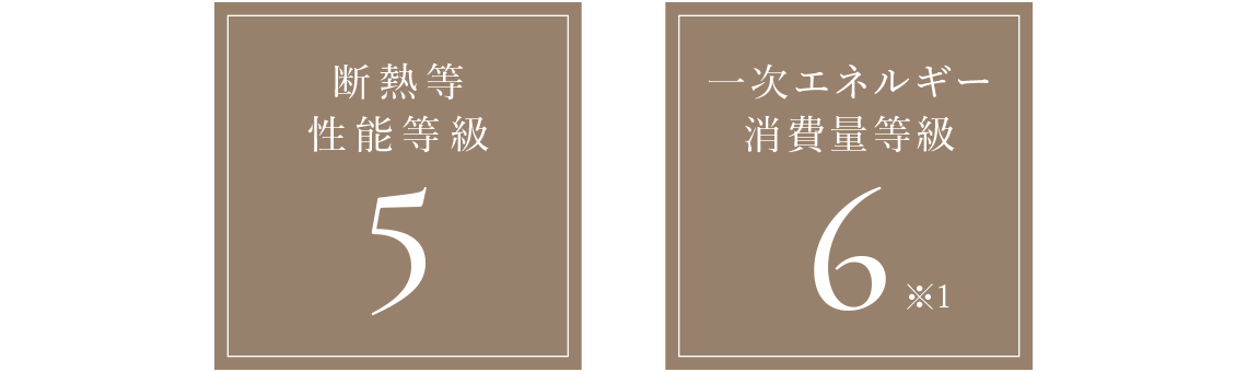 國に登録された第三者機関により住宅の品質が評価される「住宅性能表示制度」においても、斷熱等性能等級5、一次エネルギー消費量等級6(※1)を取得しています。