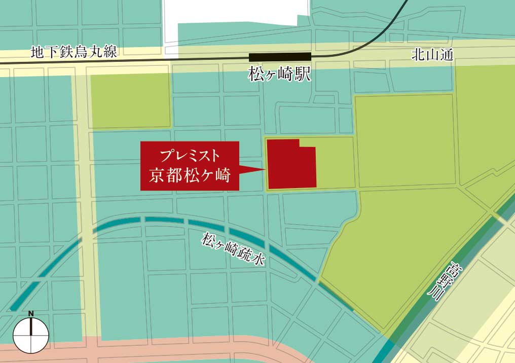 「プレミスト京都 松ケ崎」は、北?南?西側(cè)を低層の住宅が立ち並ぶ、第一種低層住居専用地域に囲まれています。