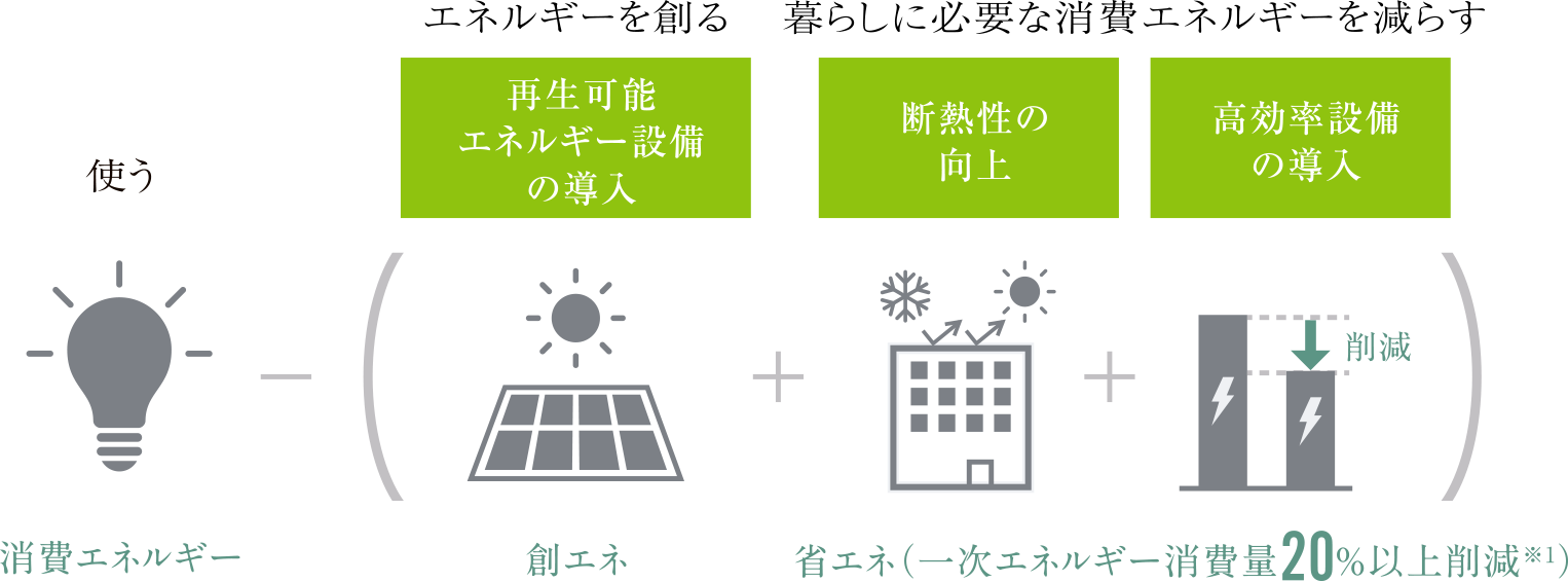 屋根に太陽光発電設備を設置したZEH-Mでは、創り出したエネルギーを日常生活に利用することで、年間のエネルギー収支を削減することも可能です。