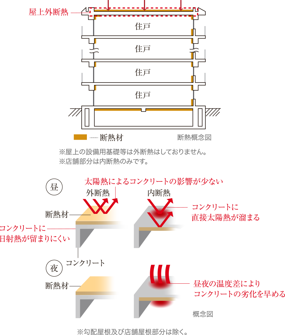 屋上には斷熱材を屋外側に敷く外斷熱工法を採用。內斷熱工法に比べて熱の影響が少なくなります。