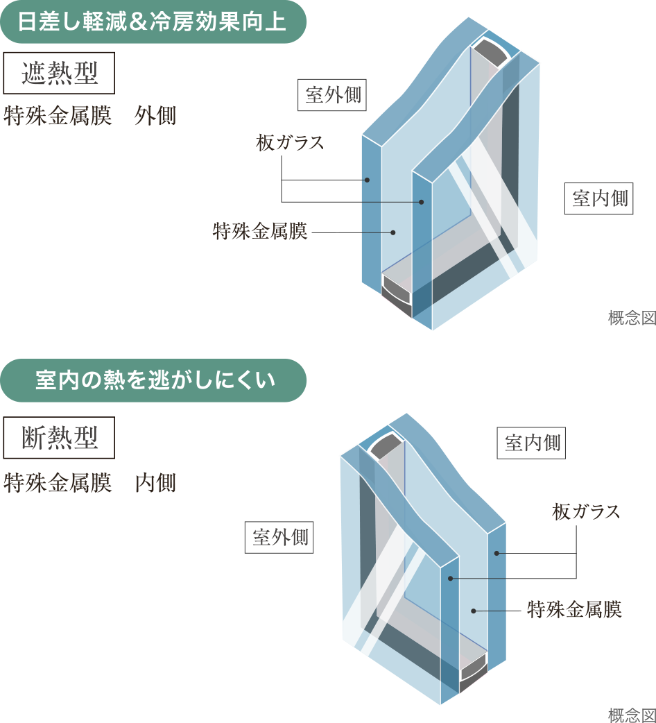 當物件の窓ガラスには、特殊金屬膜により夏の日差しを軽減し、冷房効果を高める遮熱型のLow-Eガラス、室內の熱を逃げにくくした斷熱型のLow-Eガラスを使い分け採用しています。
