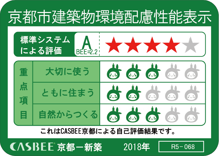 建築物の環境性能を評価する建築物総合環境性能評価システムをベースにした評価システムが「CASBEE」です。これは、建物を環境性能で評価して「Sランク」「Aランク」「B+ランク」「B-ランク」「Cランク」の5段階で格付けするもので、「プレミスト京都 松ケ崎」はAランクをマークしています。