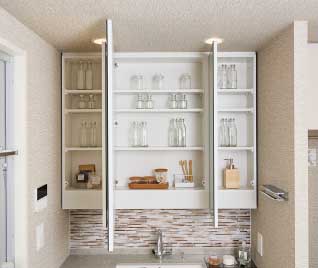 化粧品や身だしなみ用品などパウダールームで使うこまごまとした物を鏡の裏に収納できます。