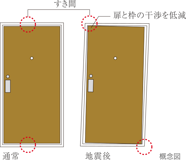 扉と枠のすき間を大きく確保することで、地震時に扉と枠の干渉を低減し、ドアが開放できなくなる可能性を軽減します。
