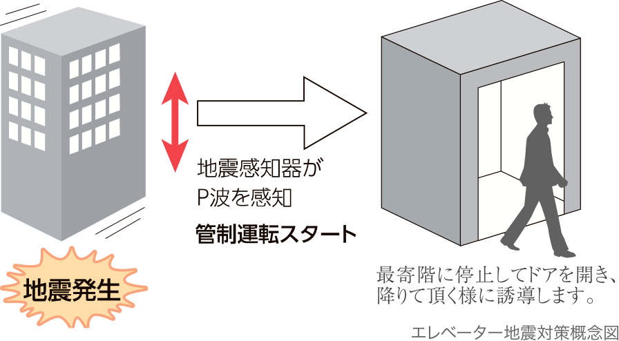 地震には初期微動(P波)のあと、強い揺れを起こす本震(S波)がやってきます。地震?停電対策機能付きエレベーターは、初期微動(P波)を感知した時點で最寄り階に停止し、扉が開きます。