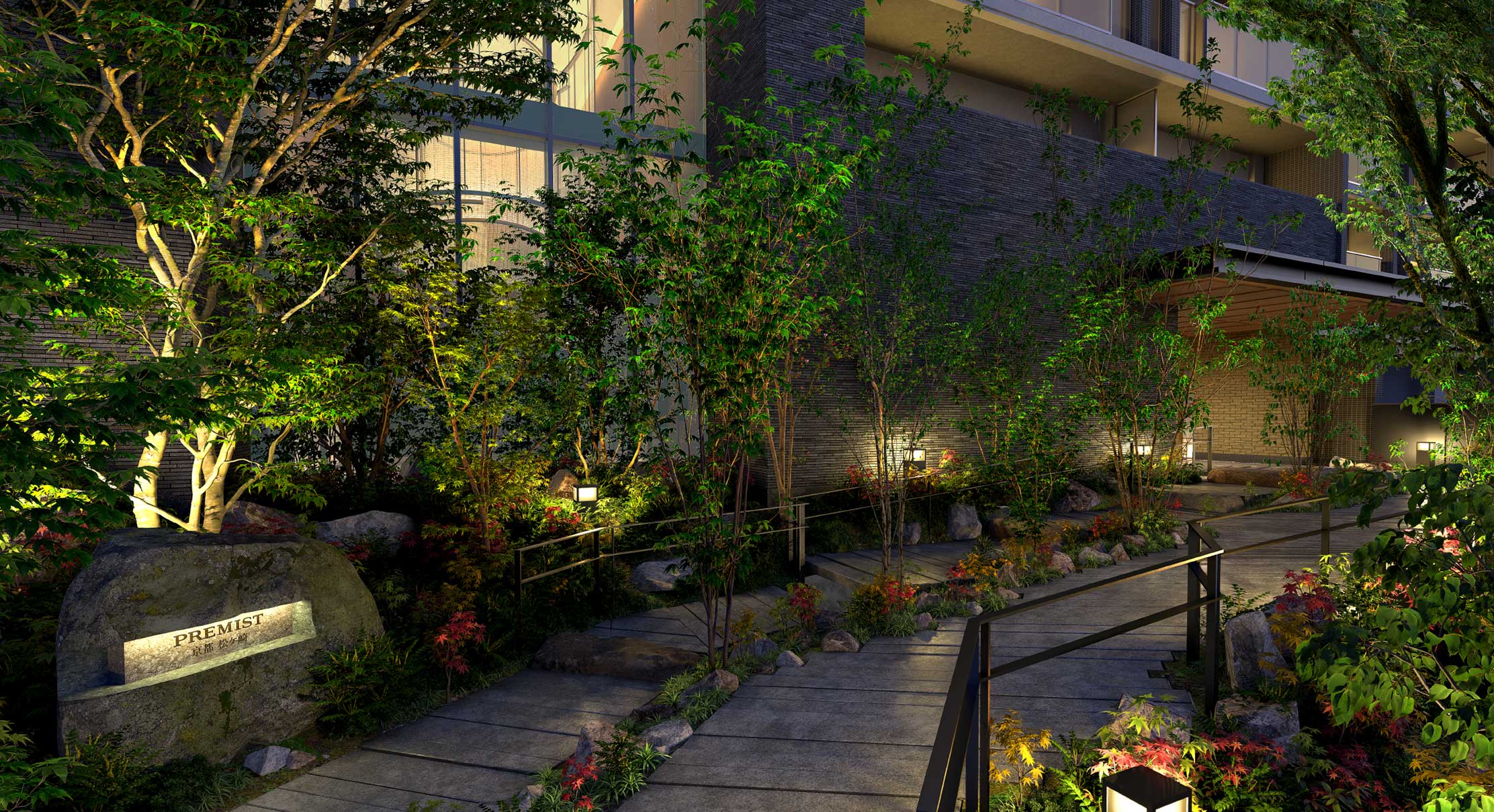 プレミスト京都 松ケ崎では、庭と建物が一體となり自然と人のつながりを生むことをテーマのひとつにしています。作庭が行われた數ある庭のなかでも、メインアプローチと敷地中心部の季織の庭では、潤い豊かなシークエンスを味わうことができます。それは京都の庭園文化が培ってきてた美と技の継承。自然を理解し、敬い、そしてつながりあう。変わりゆく時代のなかでも、変わらない京都の精神美が息づいています。