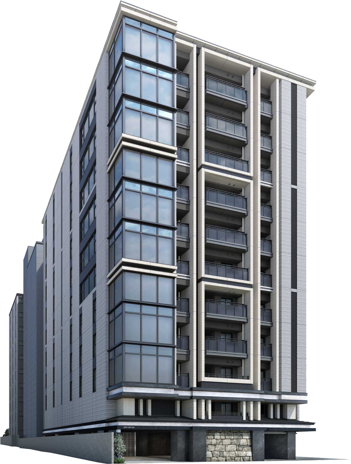 中京區の主要な南北の通りのひとつである堀川通。新舊の洗練が出逢う三條通。「プレミスト京都 三條堀川」の外観デザインにも都心の美しさと新舊の洗練美を描き出しました。基壇部は、二條城の東大手門の様を映し出し、その上にはスリット、マリオンを使用し格子を表現。下層から上層にかけては3層を1つのまとまりとしたマリオンで障子をイメージしたデザインとしました。遠景にはコーナーサッシのガラスが際立つ都會的な洗練を、近景では端正な京都らしい風情を描き出します。
