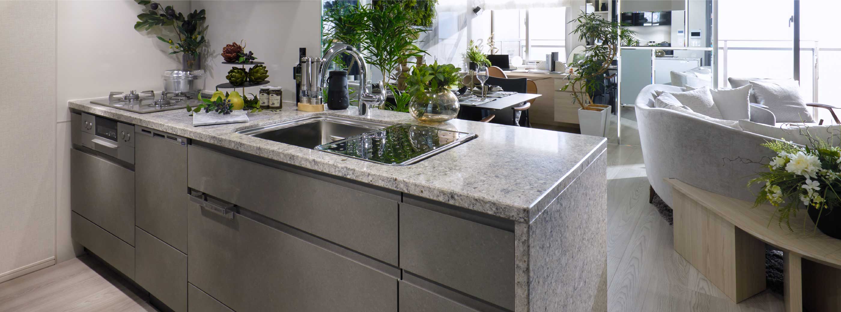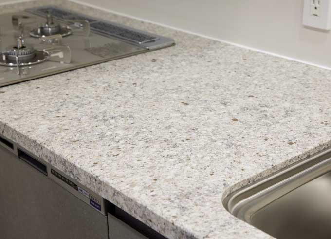 天然水晶を主成分とするフィオレストーン。天然石のような風合いを持ち、天然石と比較して汚れが染み込みにくい機能性を両立します。