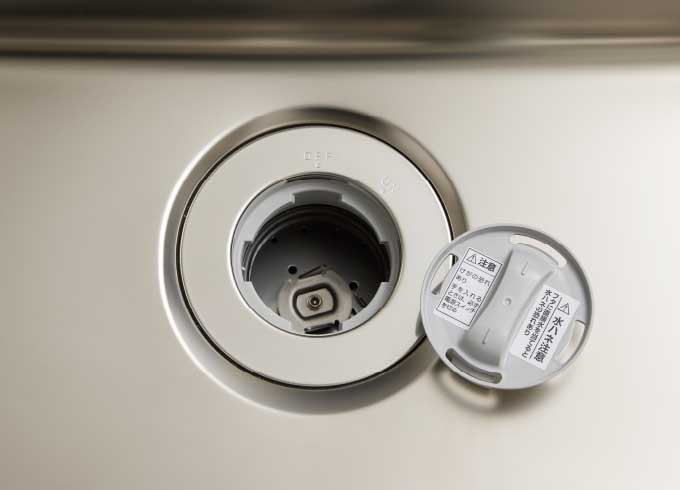 排水口部で生ゴミを粉砕して排水と一緒に流し、敷地內に設けた処理裝置で生ごみを分解し下水道に流すディスポーザを設置。ディスポーザのスイッチを入れると水栓から自動で水が流れる自動給水裝置付きです。