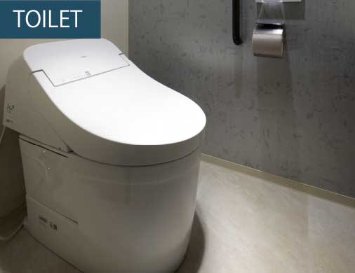 汚れがつきにくく、お手入れもしやすい節水型トイレ。人の動きを検知して、便座ふたが自動で開閉します。