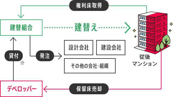 ※1 保留床 … 権利変換後にデベロッパーに売卻する建物?敷地?専有面積など、いわゆる住戸や不動(dòng)産のこと。デベロッパーは、取得した保留床を分譲します。